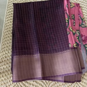 This saree features a Coral Pink body with subtle checks, paired with a vibrant pink floral printed pallu that adds a refreshing charm. The elegant zari border enhances the overall look, making it perfect for festive occasions as well as elegant daily wear.