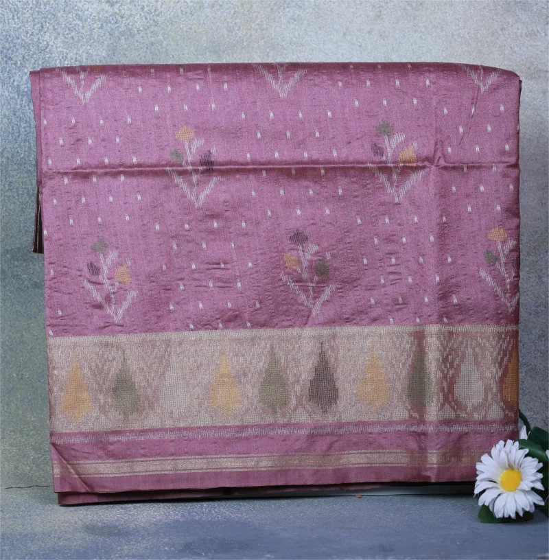 Enhance your ethnic wardrobe with this elegant Dusty Rose Pink Semi Raw Silk Saree, crafted to reflect timeless charm and graceful sophistication. The saree features a soothing muted rose pink base adorned with delicate woven floral butta motifs, creating a soft and elegant visual appeal.