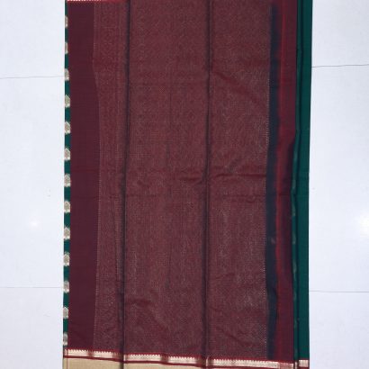 Experience the perfect blend of comfort and elegance with this Green Pure Silk Cotton Saree with Gold Zari Butta & Maroon Contrast Border, designed for women who appreciate understated luxury. The saree features a rich dark charcoal grey base enhanced with delicate gold zari butta motifs, creating a subtle yet sophisticated look.