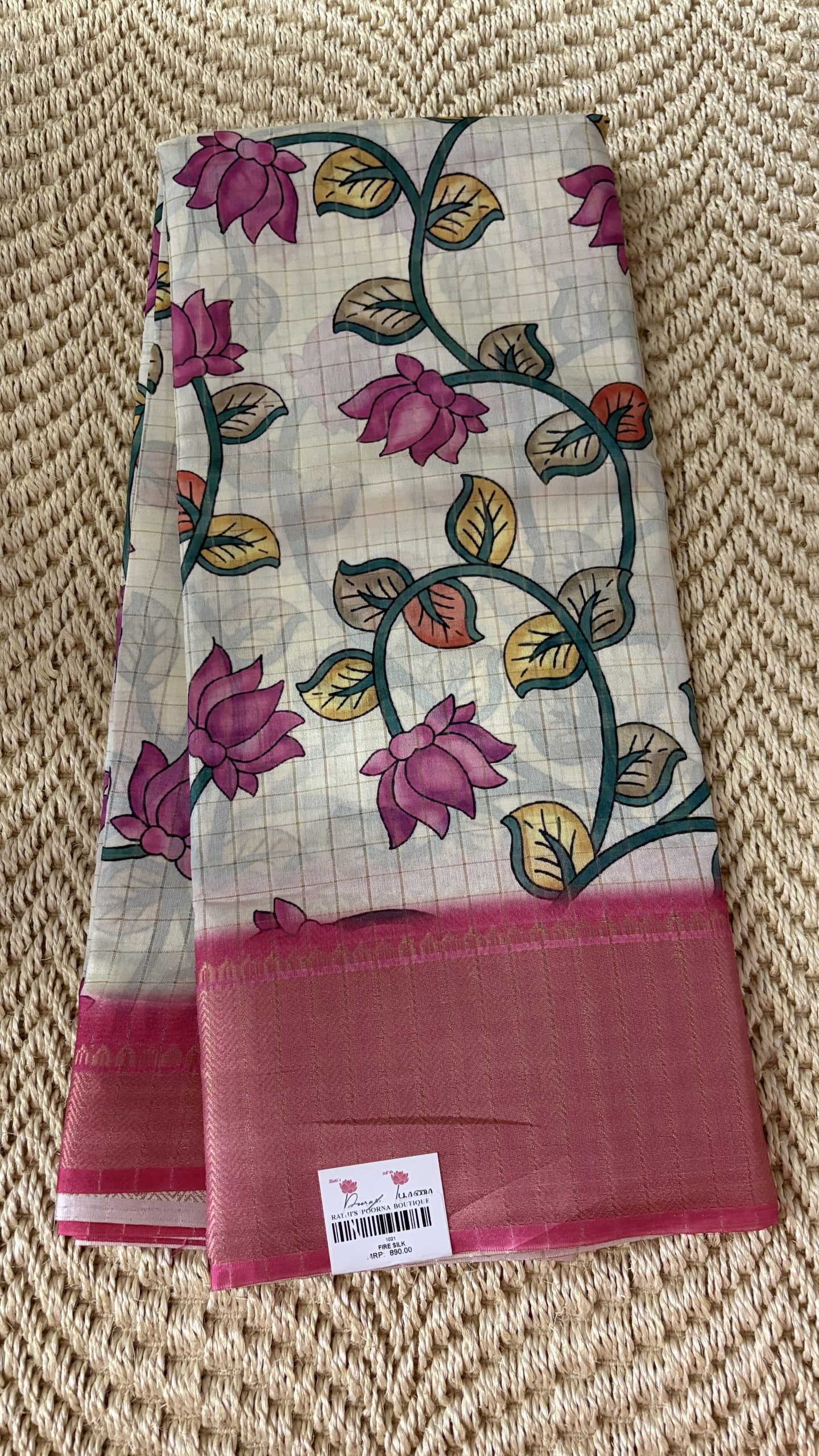 This saree features a Light off-white body with subtle checks, paired with a vibrant pink floral printed pallu that adds a refreshing charm. The elegant zari border enhances the overall look, making it perfect for festive occasions as well as elegant daily wear.