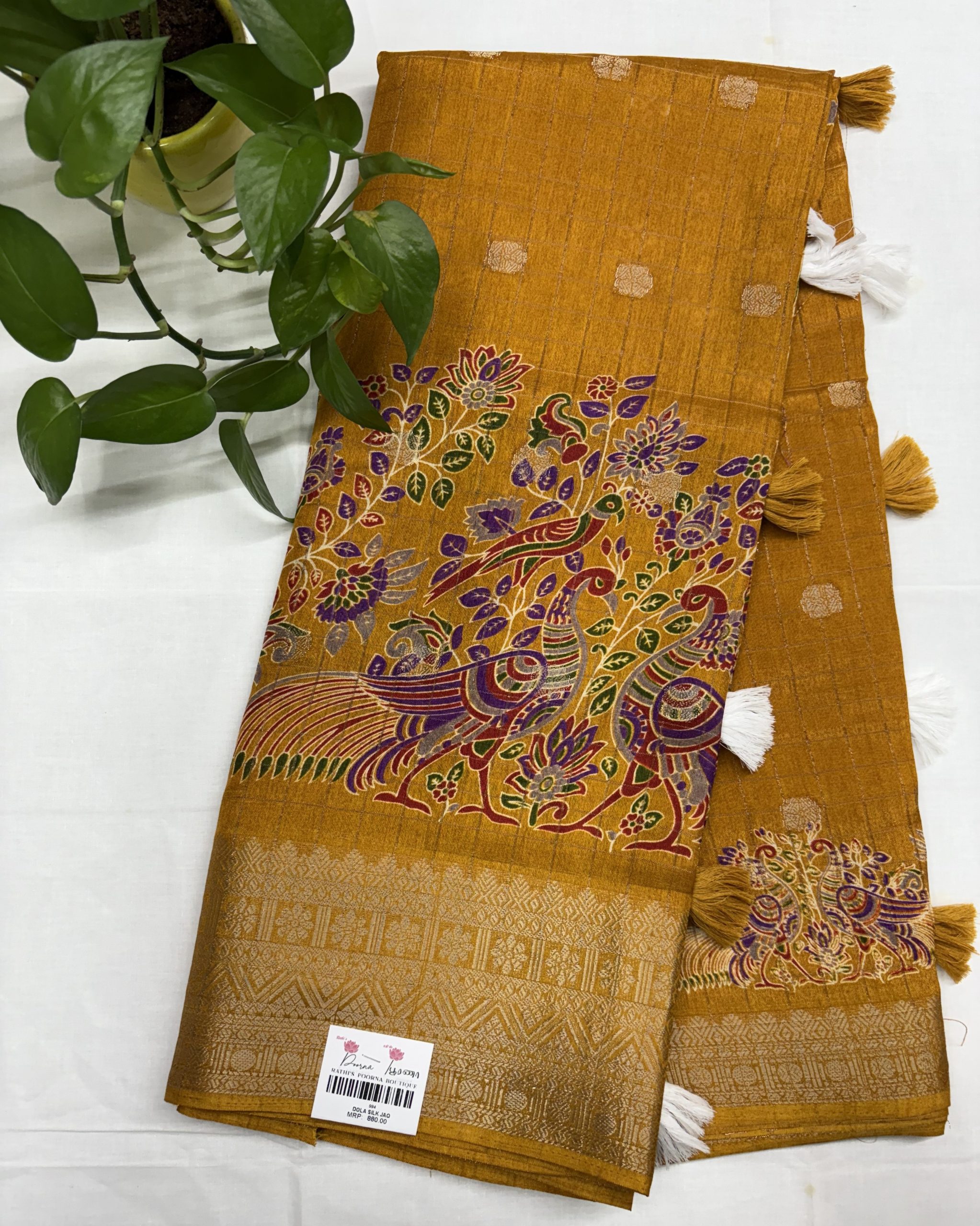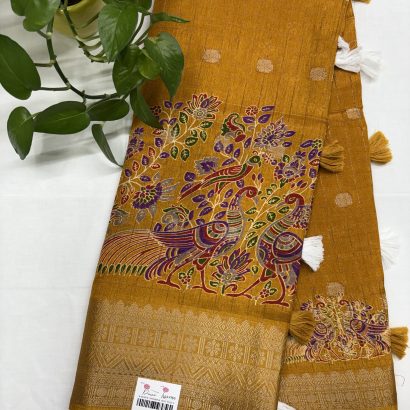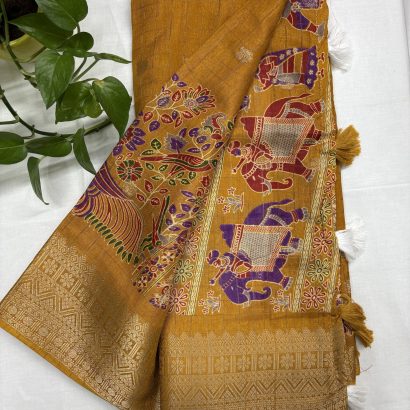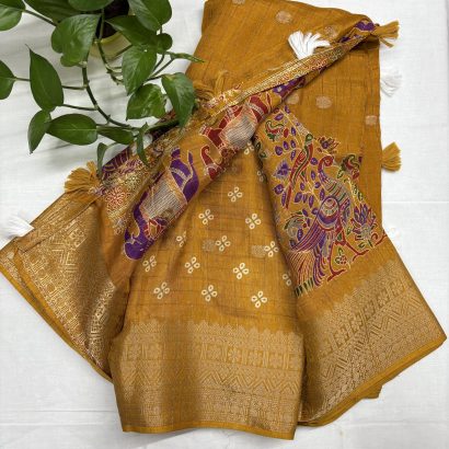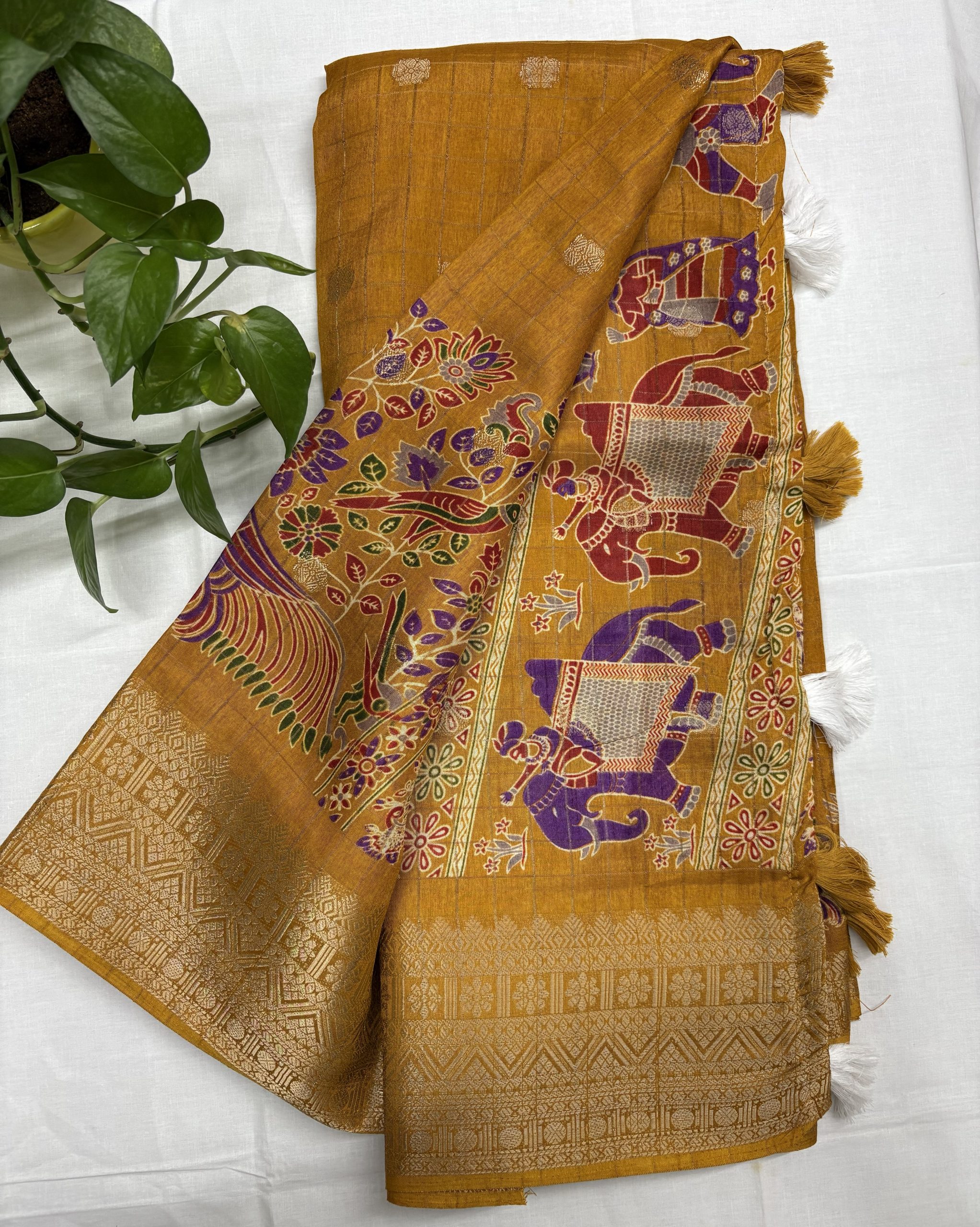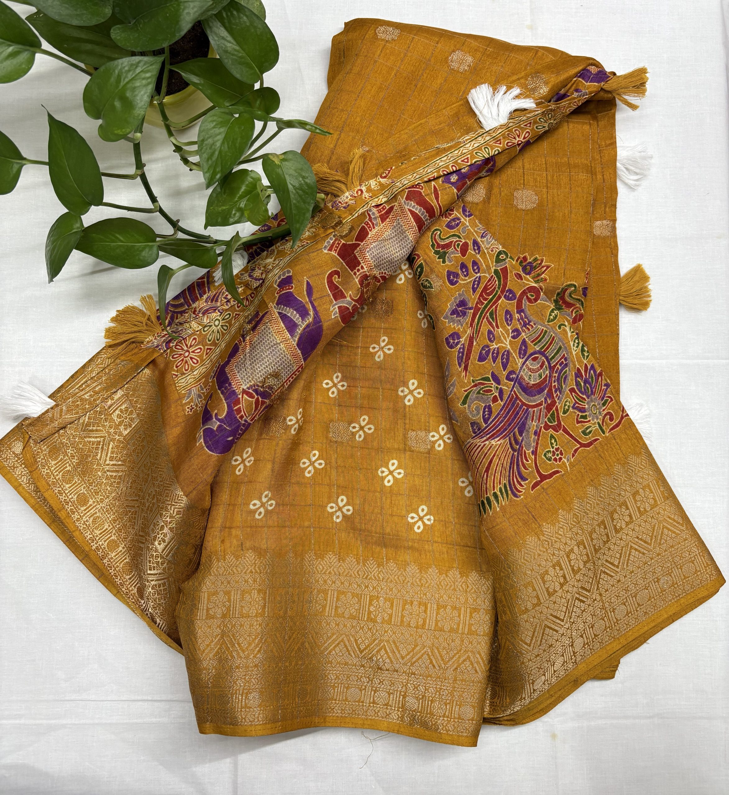 Elevate your ethnic wardrobe with this exquisite Semi Dola Silk Saree in a stunning mustard yellow shade, crafted to bring together tradition, elegance, and vibrant artistry. Perfect for weddings, festive celebrations, and special occasions, this saree beautifully showcases intricate craftsmanship and luxurious detailing.