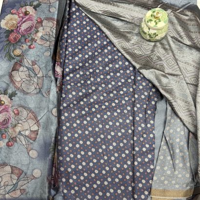 Premium Tussar Silk Saree featuring a stunning multi-color digital print with abstract and floral designs. A royal, contemporary drape perfect for special occasions.
