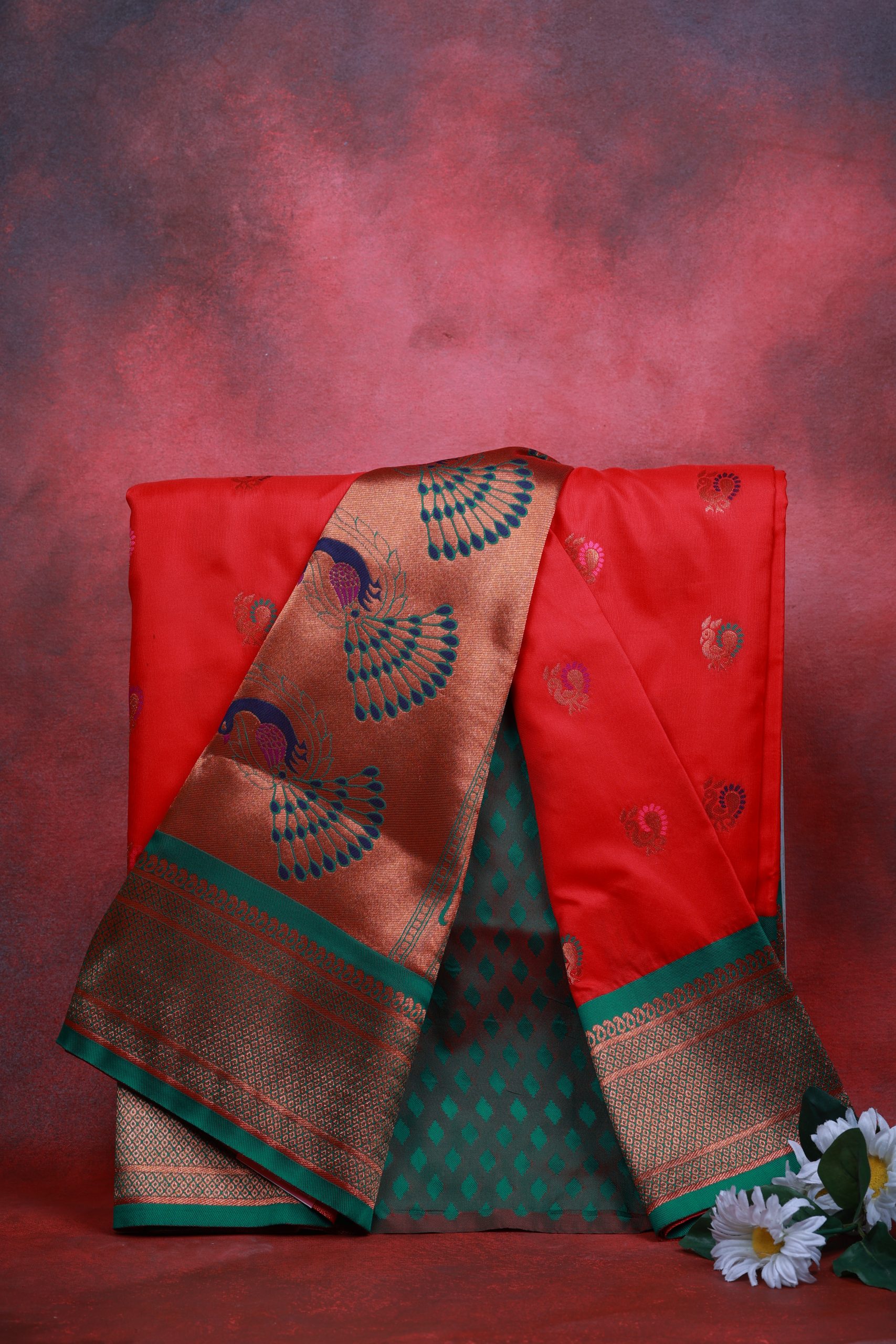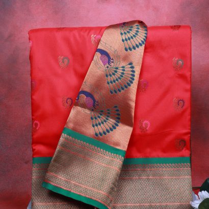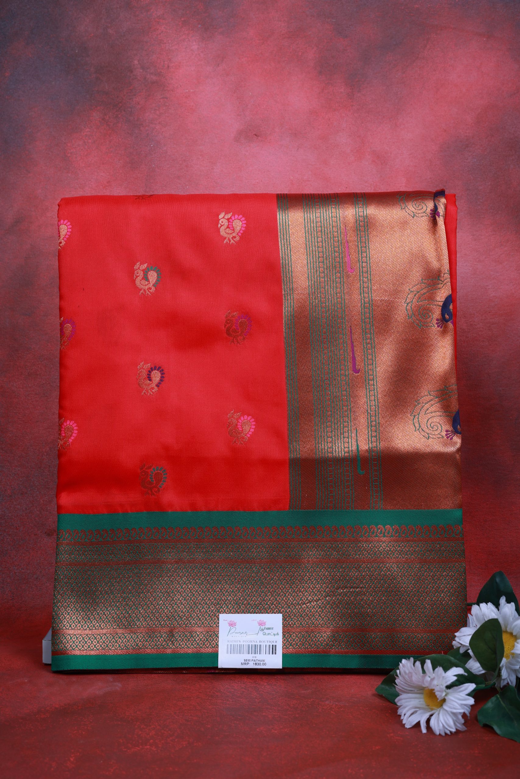 Elegant Red Semi Paithani Saree with rich gold zari border and peacock motifs. Perfect for weddings & festive occasions. Available at Poorna Boutique, Chennai.